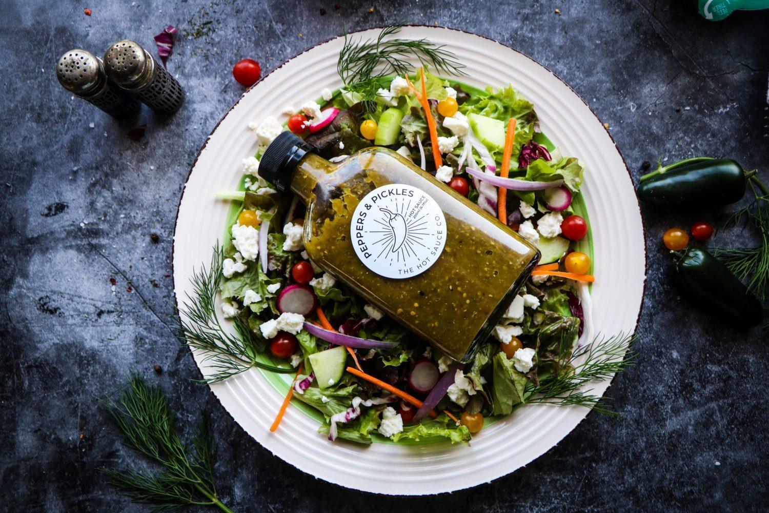 - In a small bowl, whisk together the extra virgin olive oil, Peppers & Pickles hot sauce, and if using, Dijon mustard, minced garlic, honey or maple syrup and S&P. Continue whisking until the dressing emulsifies and thickens slightly.