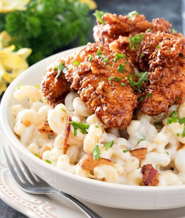 Garnish with chopped parsley or green onions for a pop of colour. Enjoy the fried chicken and our Habanero & Mango hot sauce alongside the creamy mac and cheese for a delicious and comforting meal!